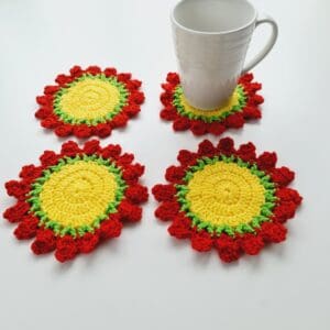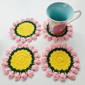 Rose Coasters with storage pot, by Sarah Lou Crafts. This set of 4 crochet coasters is a stylish and functional addition to your sustainable home décor. Made from premium acrylic yarn, these handmade homeware drinks mats are made to last and provide a protective and decorative surface for your tabletop. They can then be folded and stored in the white storage pot to look like a pretty bouquet of roses when not in use. 15cm (6″) diameter from petal tip. Yellow middle section 8cm (3.5″), fits a standard mug/cup.