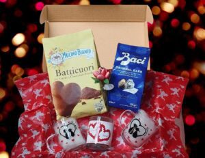 Romantic Italian Valentine’s Day Gift Box, by Dottie Bonnar. Celebrate love this Valentine’s Day with our exquisite Italian romantic gift box. This beautifully curated box includes heart-shaped Batticuori biscuits made of cocoa and dark chocolate, a pack of Baci Perugina fine chocolate pralines with hazelnuts (with a secret love message in each chocolate), a romantic candle, two hand-painted glass cups adorned with charming cat designs, and a sugar-coated chocolate flower. Each item is carefully selected to create a memorable and delightful experience for your loved one. Perfect for expressing your affection and making this Valentine’s Day truly special. Order now and surprise your special someone with a gift that speaks from the heart!
