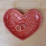 Heart ceramic dish, Ring dish, Tapas dish, Trinket bowls with lace pattern, handmade home décor, hand built stoneware tray by Marion Walsh. A very versatile heart shaped dish full of rustic charms. Food safe, so can be used as a small serving dish for tapas, or why not place chunky candles in them? Other suggestions: trinket bowl, ring catcher. This beautiful heart is perfect for Valentine’s day or to show your love at any time!