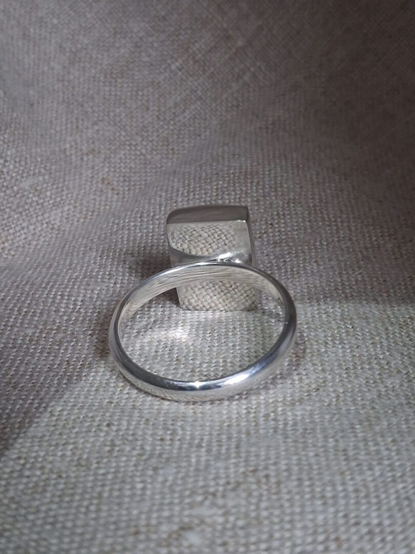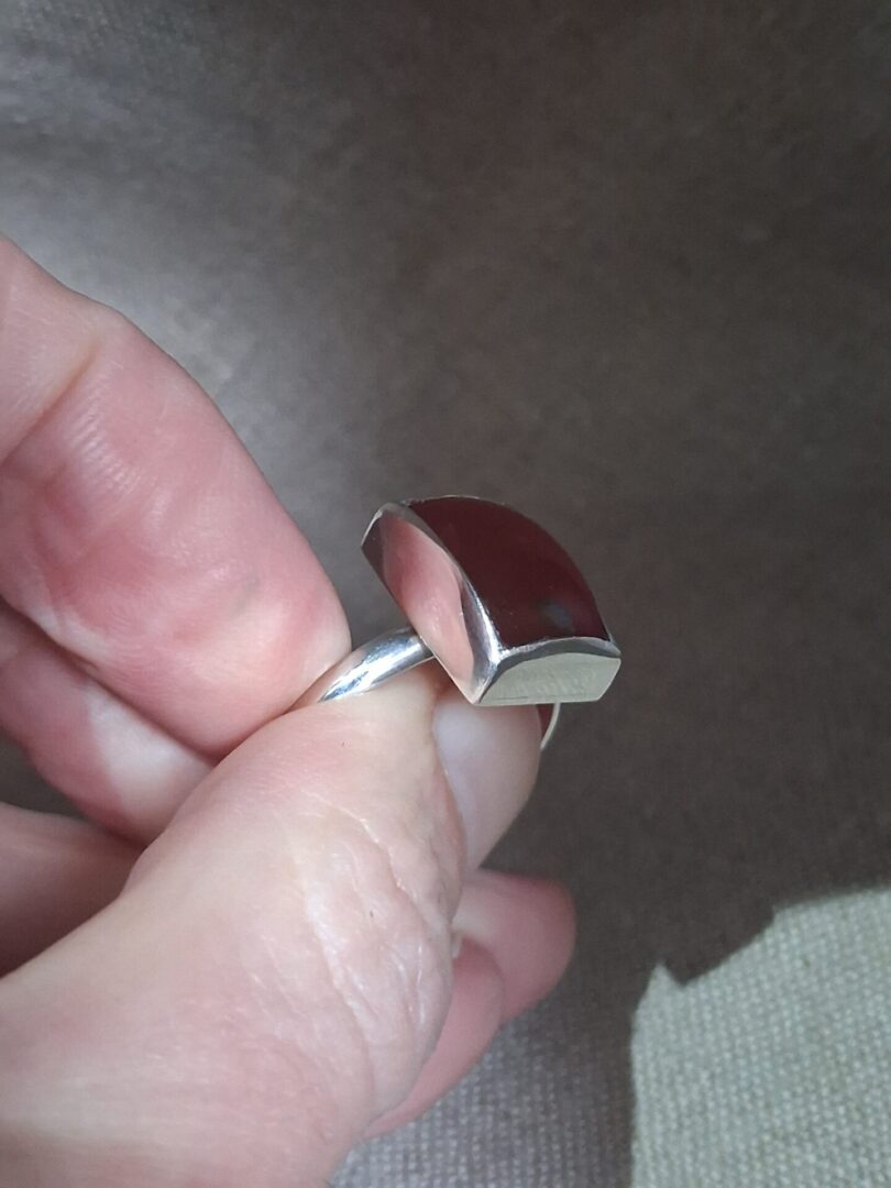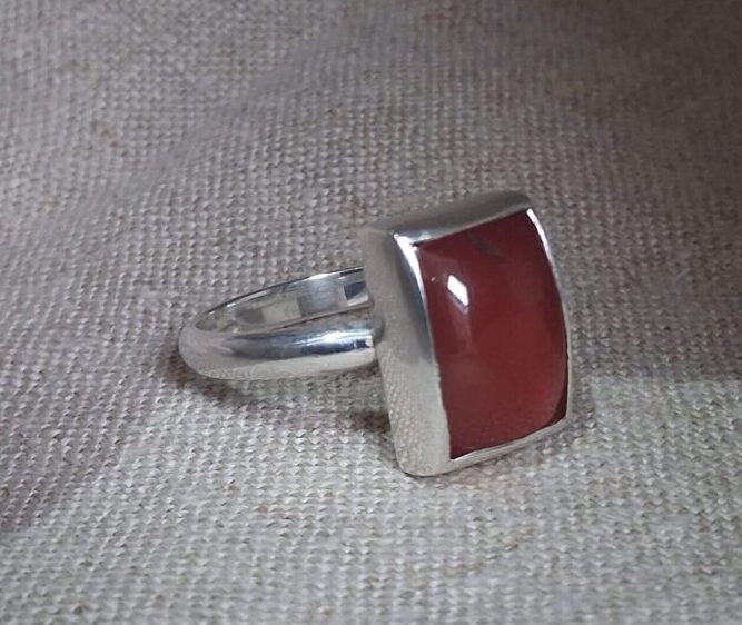 A handmade ring. A carnelian cabochon cut in a rectangle shape, is set in sterling silver with a high polished finish. UK size V. Will be presented in a sturdy black ring box with black foam insert.