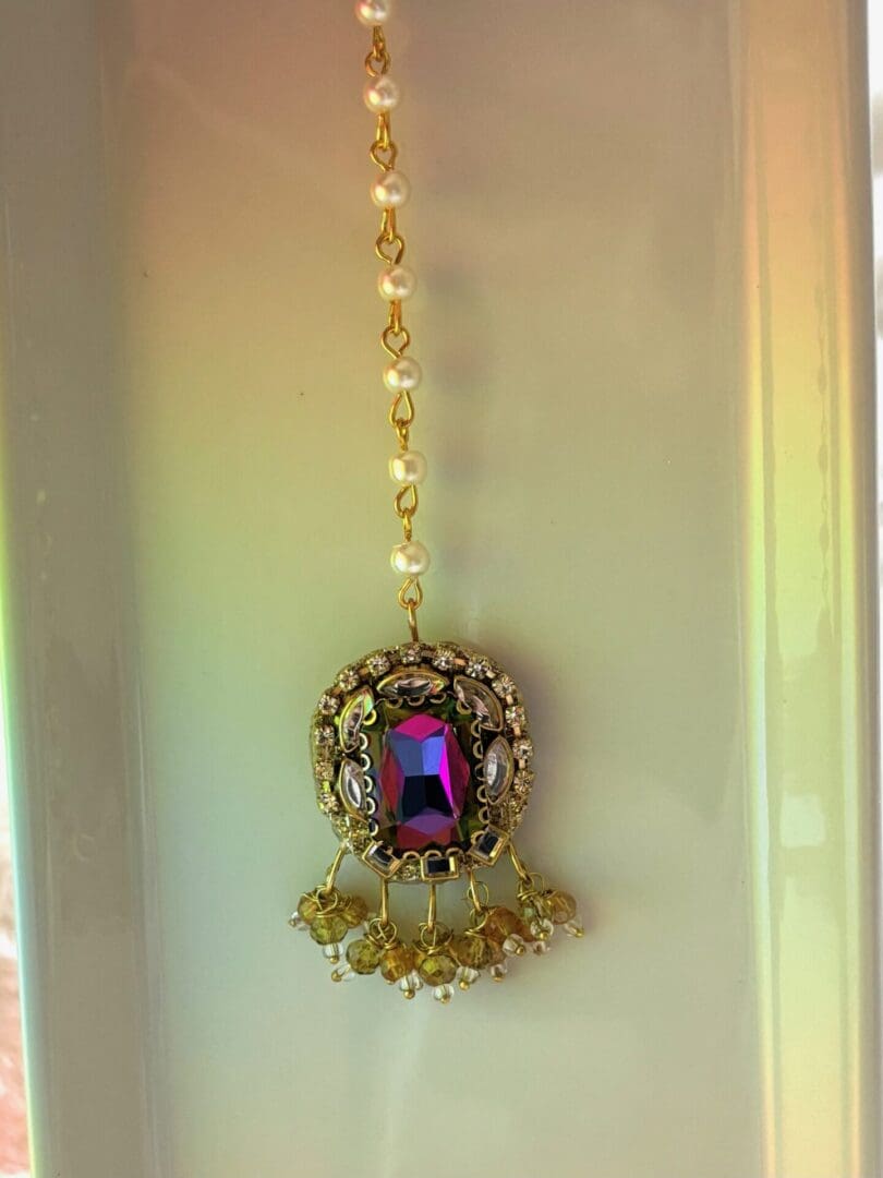 This beautiful forehead jewellery comes with a bracelet and earrings of the same theme.