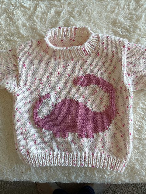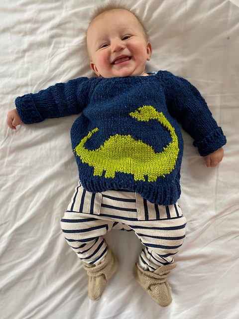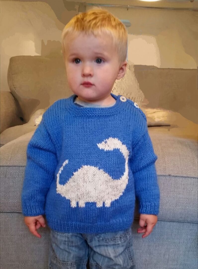 There is an easy to follow intarsia chart for the dinosaur and the pattern is colour-coded for the different sizes.