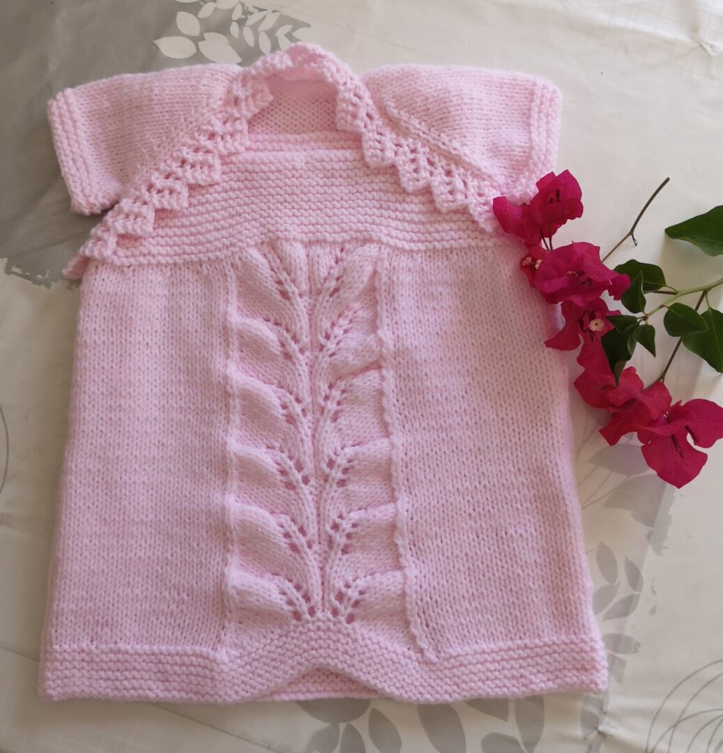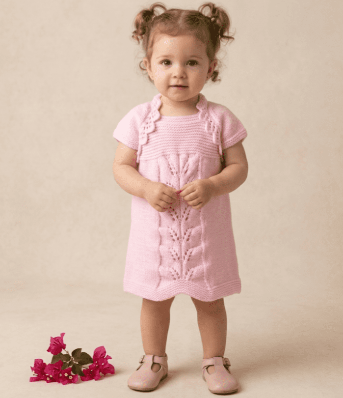 A very pretty lacy dress and shrug knitting pattern for babies and toddlers aged newborn to 24 months.