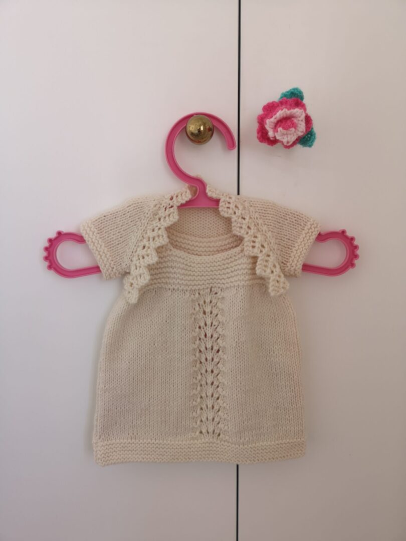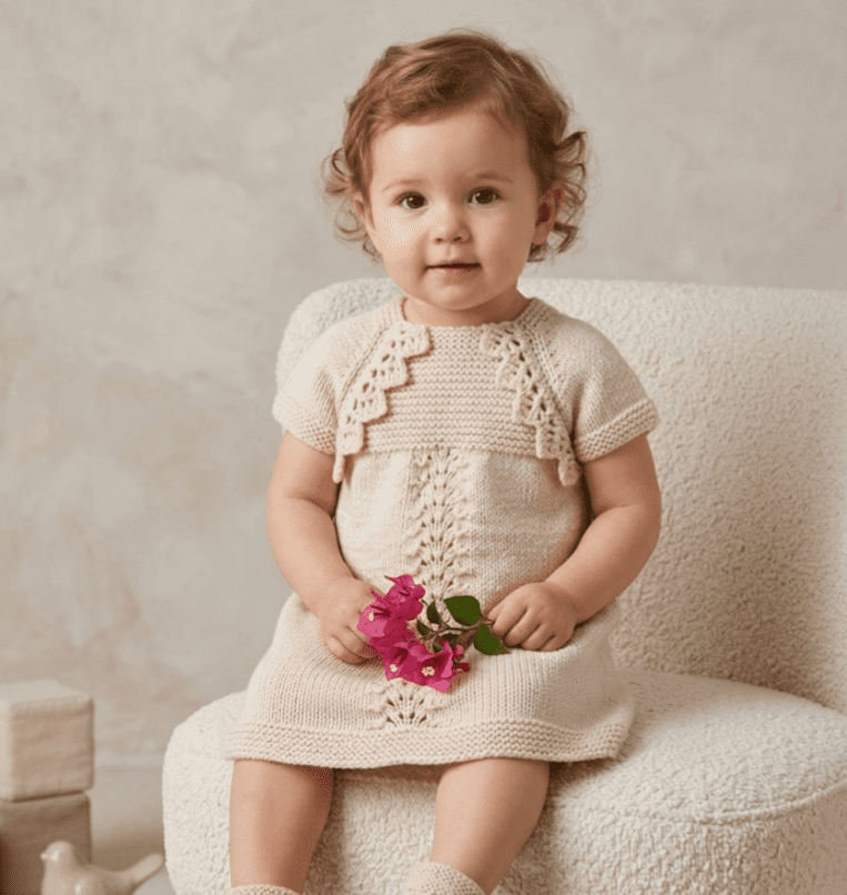 A very unique dress and bolero outfit for your baby or toddler. The knitting pattern covers the ages newborn to 24 months. The dress has a lacy panel at the front and the yoke is knitted in garter stitch. The little bolero completes the outfit with a lacy border around the edges. Your baby girl will feel comfortable and look very pretty in this hand-knitted design.