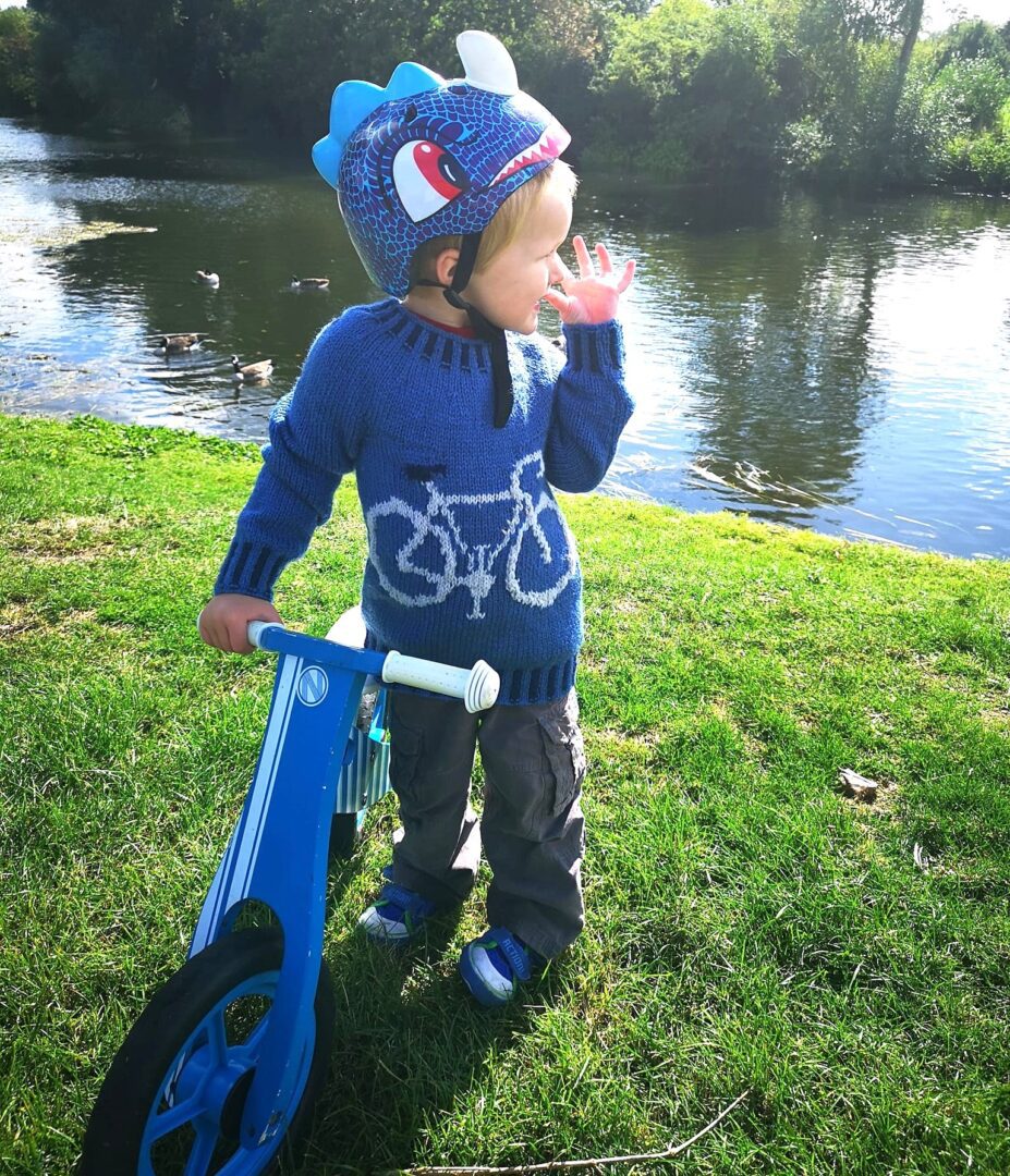 Knitting pattern for a jumper and hat perfect for a bike-mad youngster. For ages 4 to 13 years.