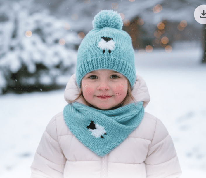 Knitting pattern for a Chunky Scarf and Hat Set featuring fluffy Sheep for children up to the age of 5 years. The scarf is designed as a loop so is easy to slip over the head.