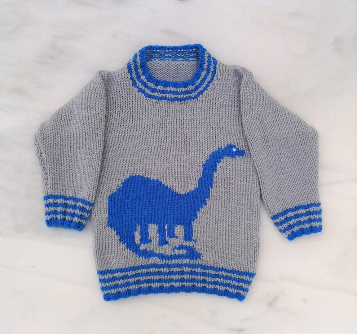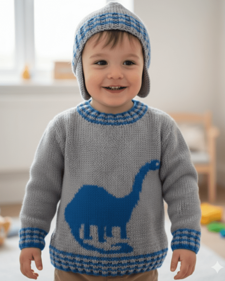 Knitting pattern for those “Dinosaur Mad” youngsters. Knitted in Aran/Worsted (10 ply) Yarn so grows very quickly. Large, coloured intarsia chart to follow for the Brontosaurs. The rib is 2 x 2 rib with a change of colour every 2 rows. Pattern covers age range 4 to 13 years.