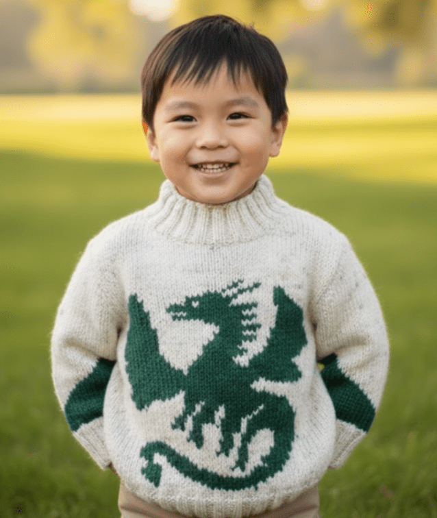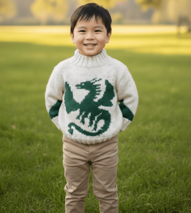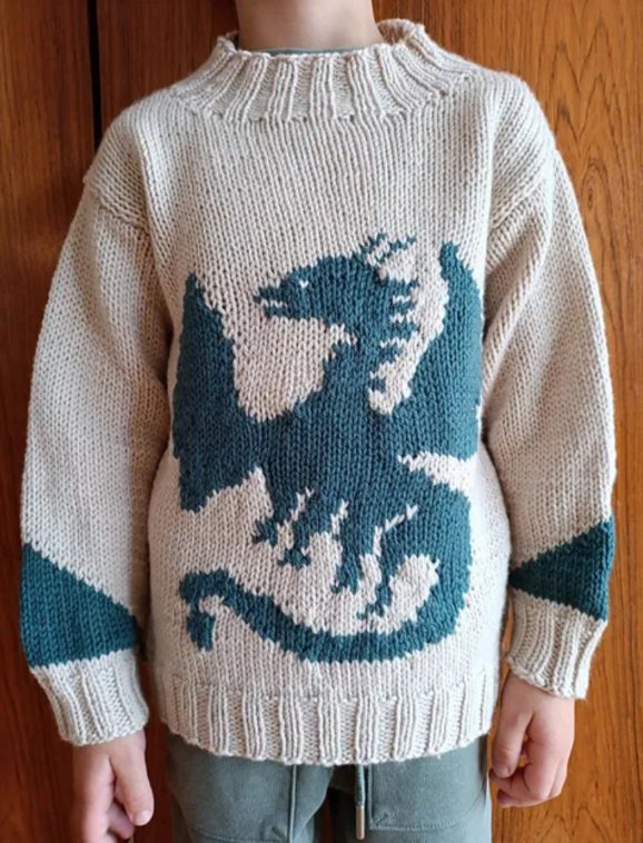 A Dragon themed jumper and hat knitting pattern for ages 4 to 13 years.