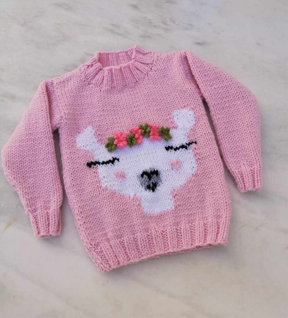 Knitting pattern for a Chunky sweater featuring an adorable Llama for children aged 4 to 11 years. Knitted in Chunky (12 ply) Yarn so grows very quickly. Large, coloured intarsia chart to follow for the Llama’s head and the pattern is colour coded for the different sizes. The flowers are knitted separately and sewn to the Llama’s head at the end. An easy and quick design to knit.