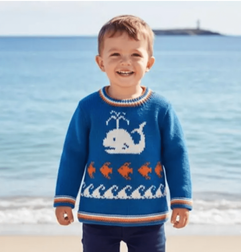 Waves, fish and a friendly whale appear on this ocean knitting pattern for a round-necked sweater for ages 2-7 years.