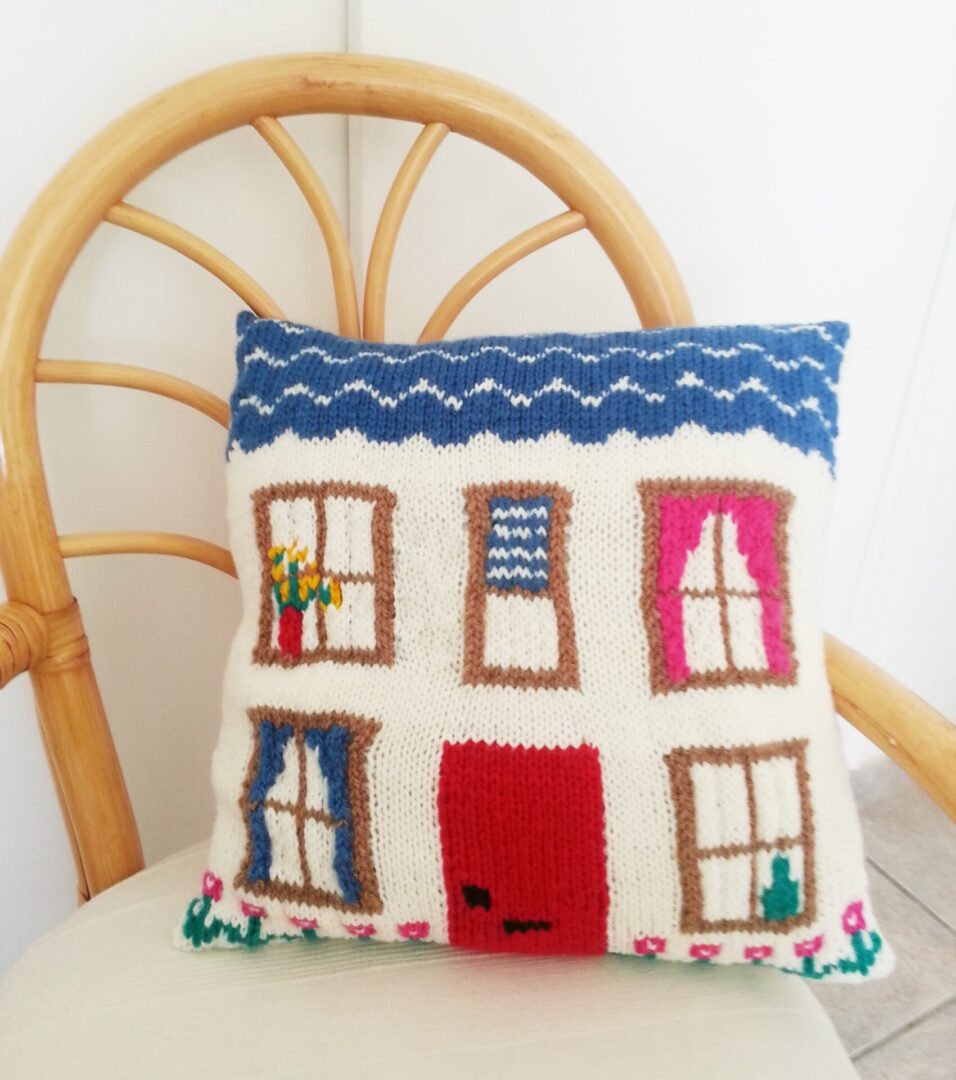 This Pretty House Pillow knitting pattern uses a combination of intarsia and stranded (fair isle) knitting. A large coloured chart is provided for you to follow. This is fun to knit and it is exciting when the house appears as you progress. You could personalise the cushion by using different colours for the door, roof, windows and curtains.
