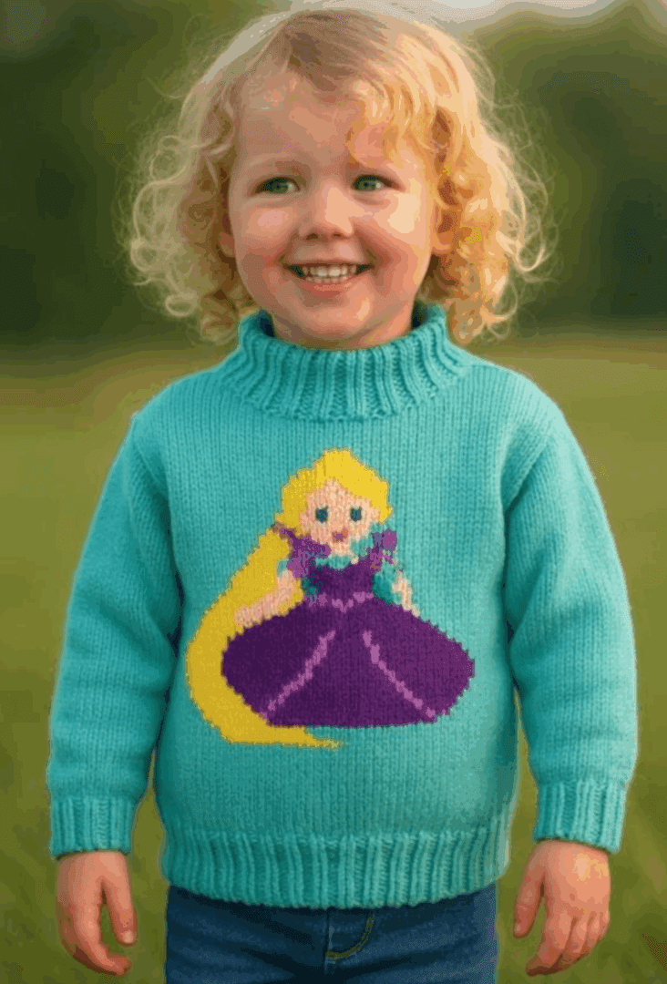 A knitting pattern for an Aran/Worsted Jumper and Crown featuring Rapunzel for ages 2 to 10 years.