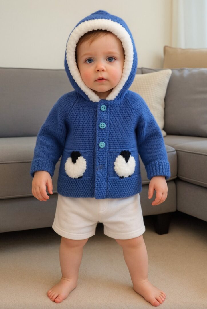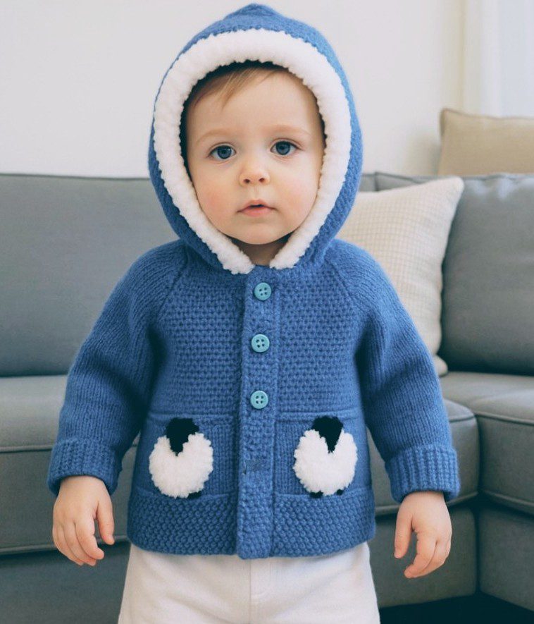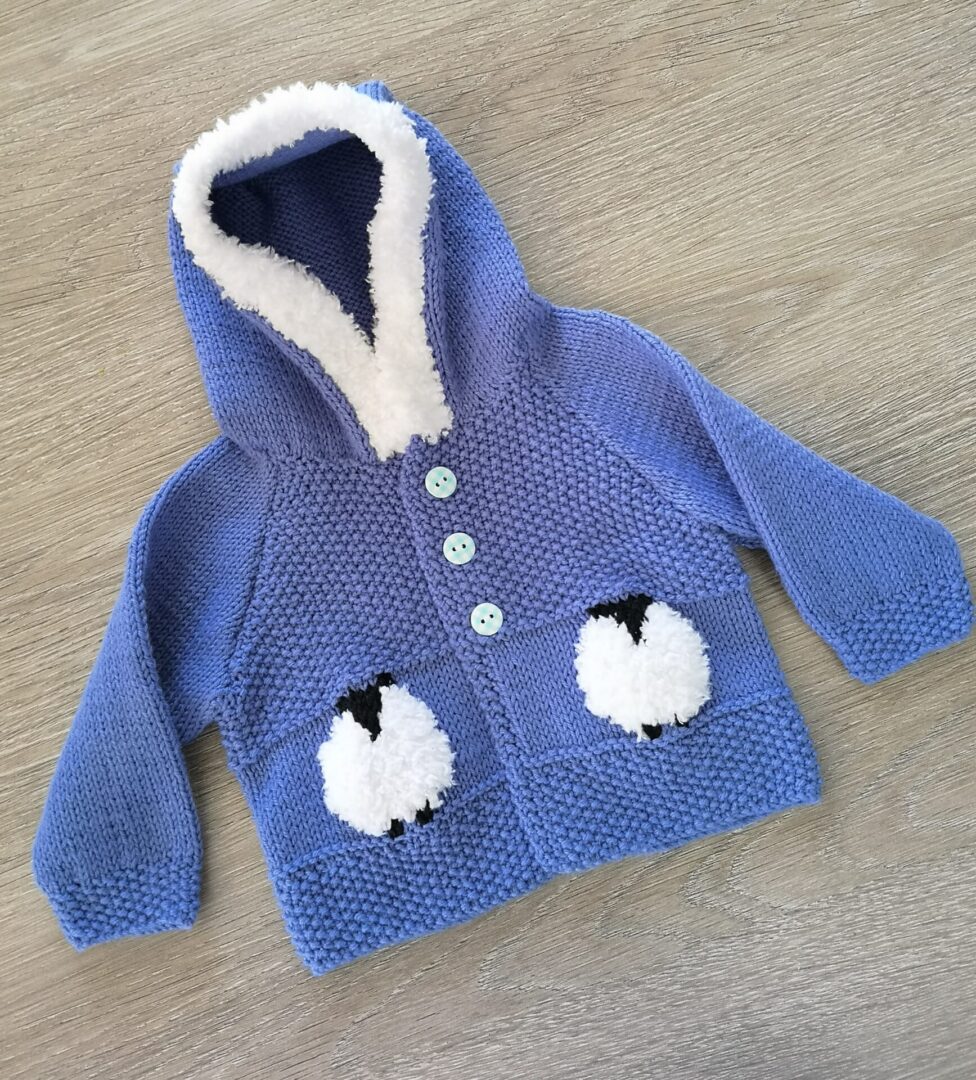 Knitting pattern for a Child’s Sheep Hoodie for ages birth to 8 years.