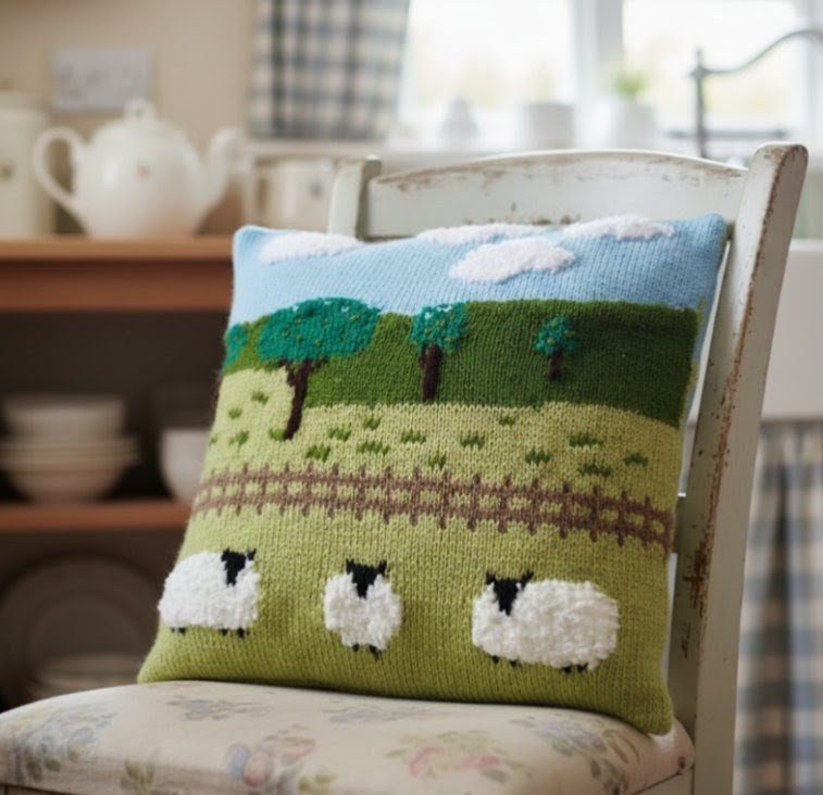 A knitting pattern for a Sheep in the Countryside Cushion.