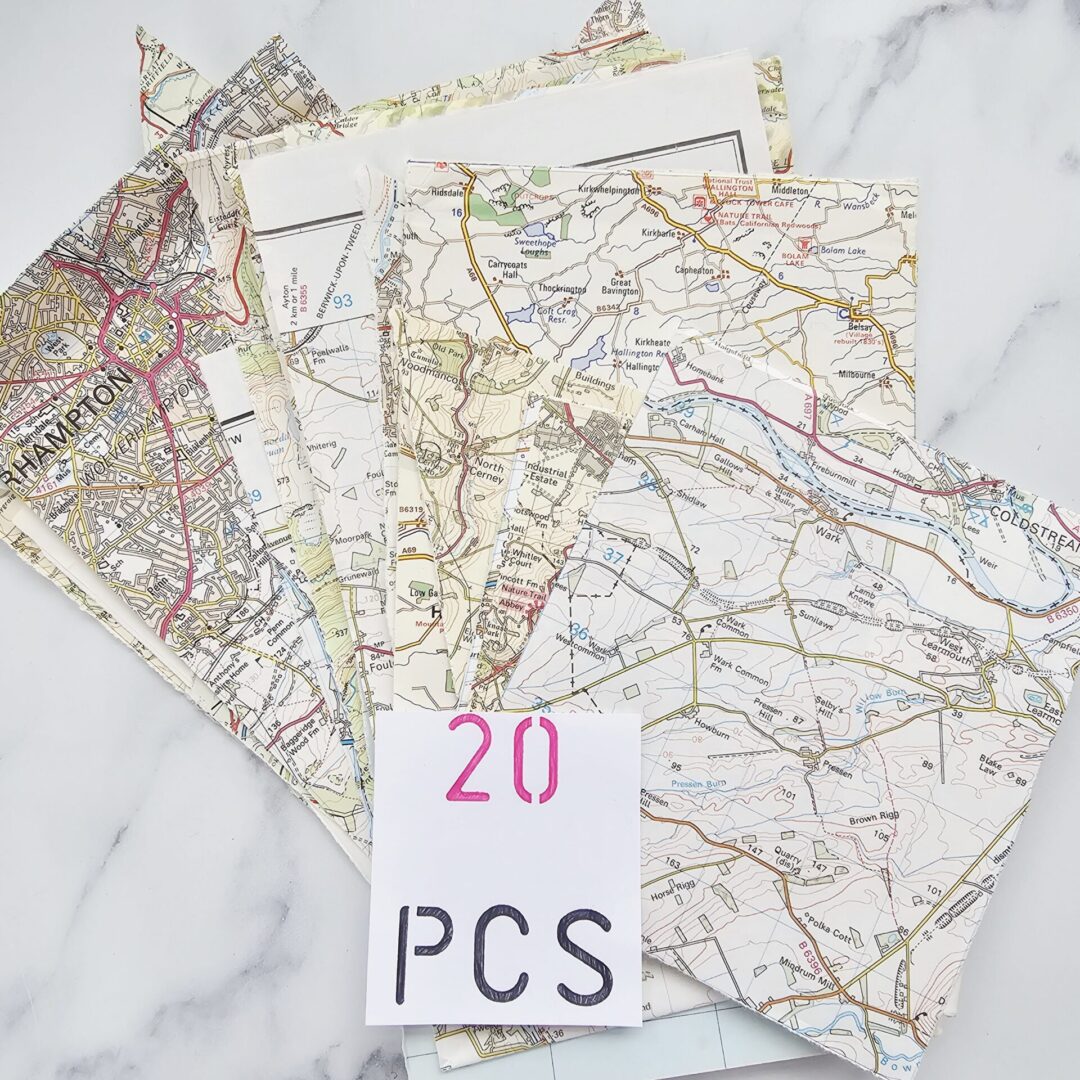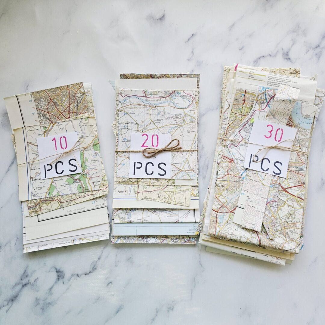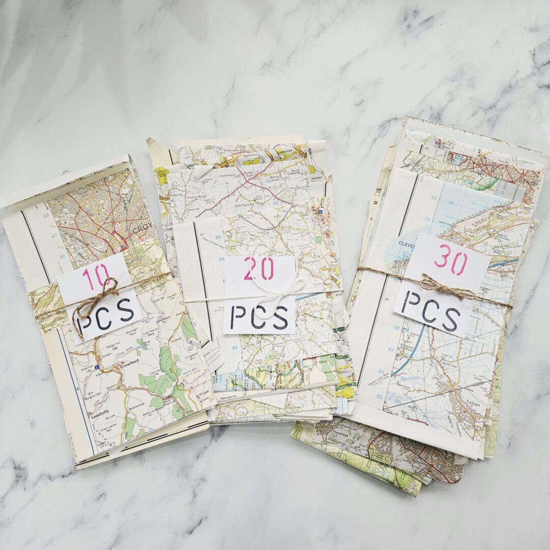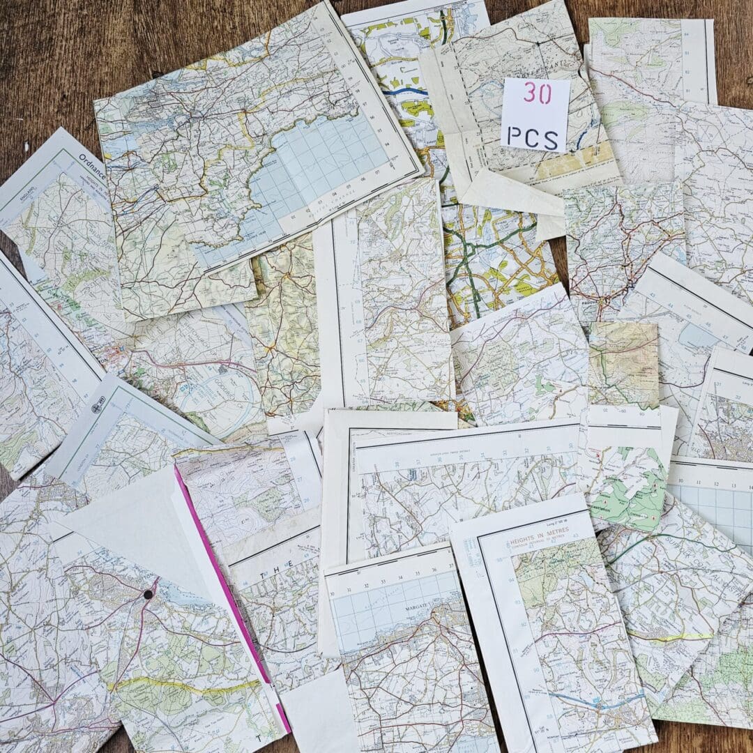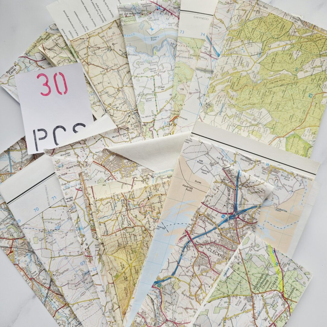 Craft project accessories of old vintage map pages from Street Atlases, AtoZ, Michelin guides, Ordnance Survey and Tourist Pamphlets.