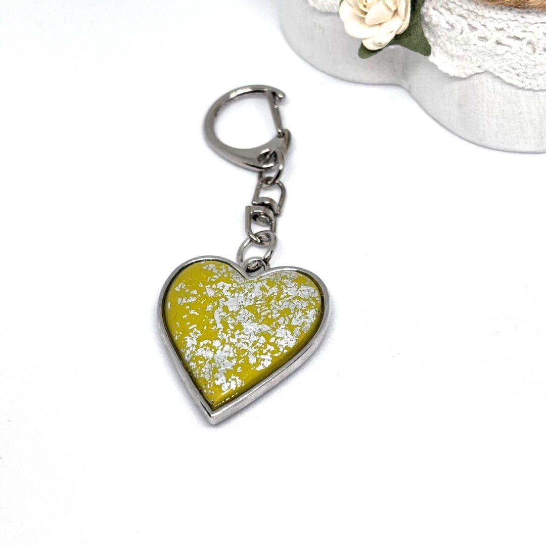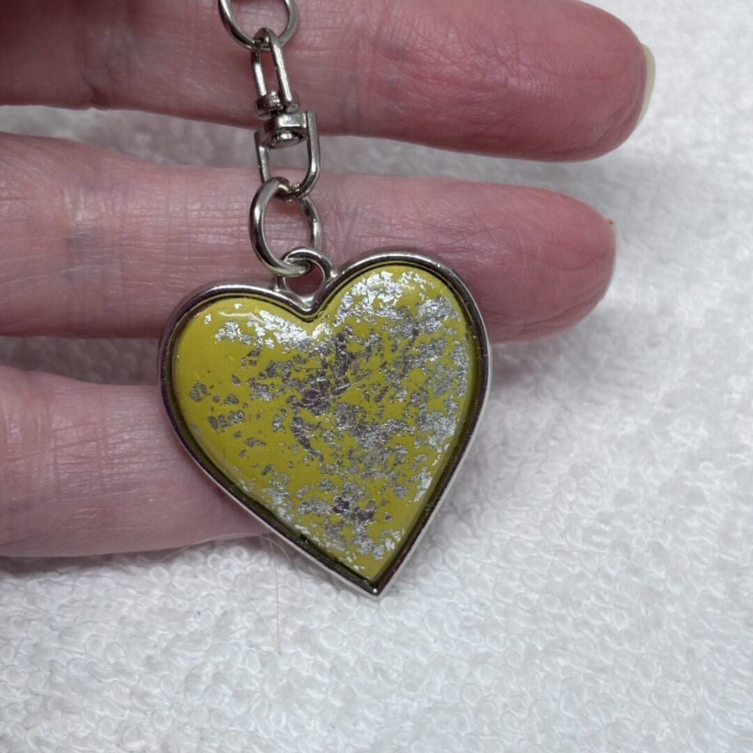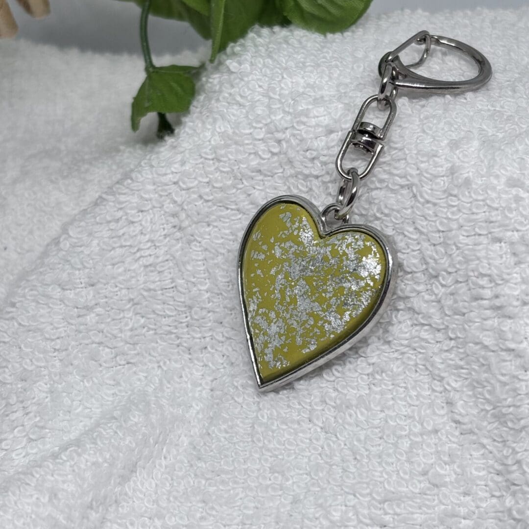 Keyring with a heart shaped pendant of polymer clay with silver foil accents in a silvertone bezel with a resin top front and back…This eye-catching accessory would make a fashionable keyring or bag charm making it a unique fashion accessory.