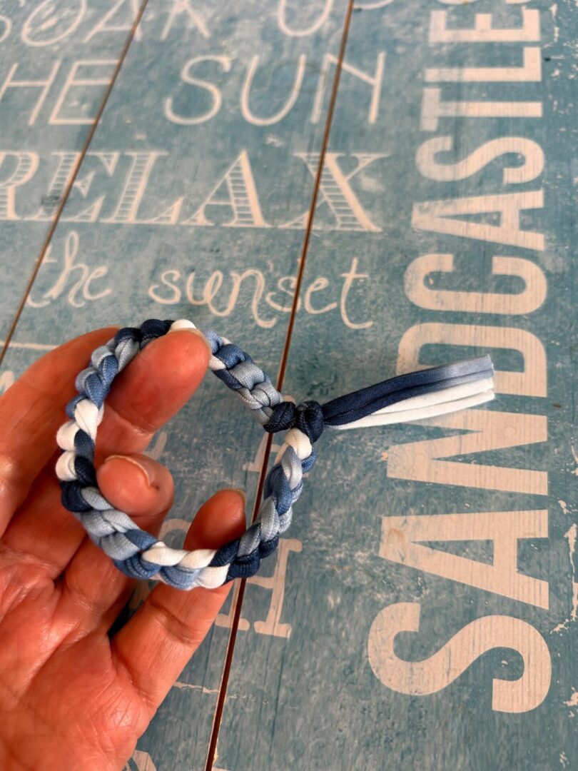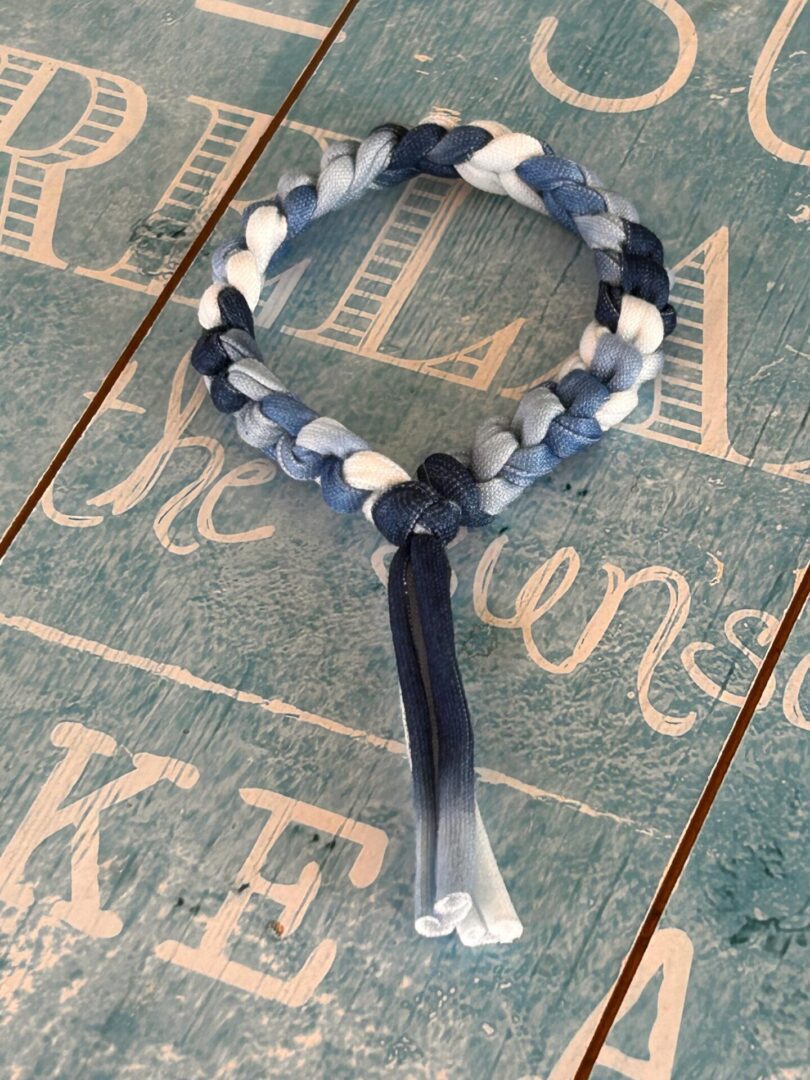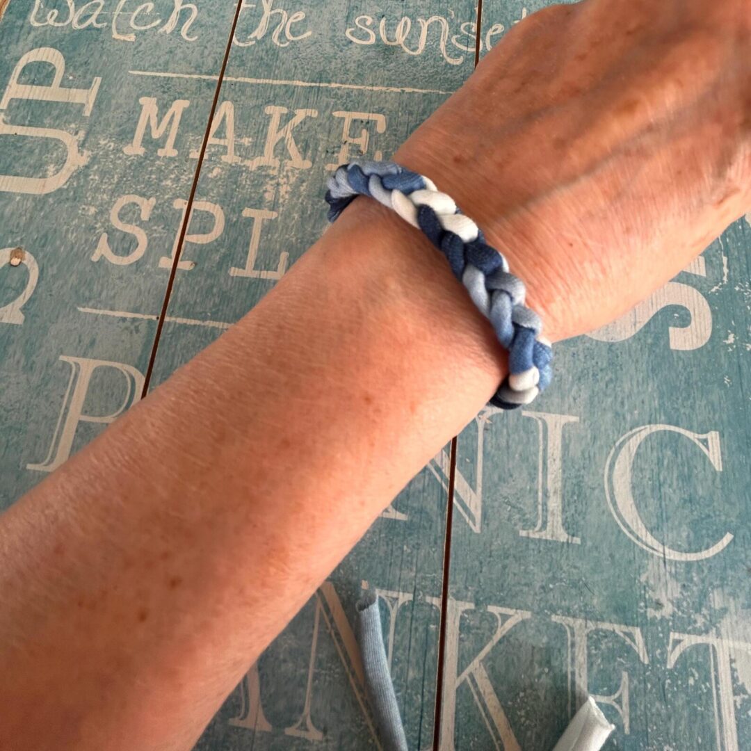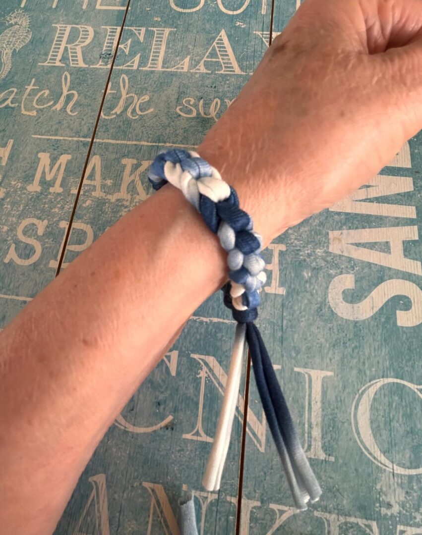 Festival feel Blue and white Tie dye look t shirt yarn bracelet is crocheted into a gorgeous narrow braided bracelet.