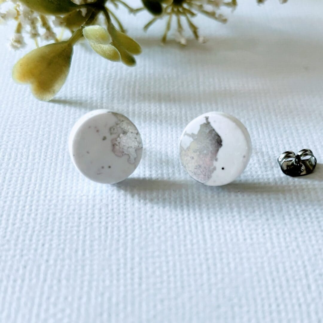 These white clay studs would make a lovely addition to your style, Each pair is uniquely crafted from white clay, finished with silver leaf for just the right touch of shine. These white button studs offer a classic look that suits both everyday outfits and special occasions.