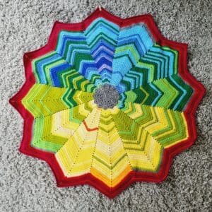 You start with the standard 12-point middle segment of the blanket using a 3.5 mm hook and DK yarns. The pattern idea is from Bella Coco Crochet and then each month will be built from each point of the star. One month to each point of the star.